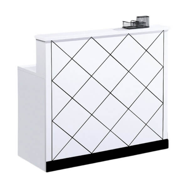 This contemporary white reception desk features a striking front panel adorned with a crisp black geometric diamond pattern, offering a bold and stylish statement for any entryway. Its clean design and functional layout make it ideal for modern offices, salons, boutiques, or creative spaces seeking a distinctive look.